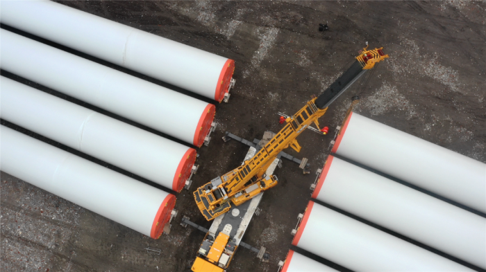 在忙碌的口岸,,,,长40米、重100吨的风力发电塔筒摆放整齐,,,,期待着一次要害的腾挪,,,,吊装空间狭隘——塔筒摆放距离较近,,,,荡距空间严重受限,,,,这是对起重机性能与操控的极致磨练。。。。。。w66利来G2代起重机XCA200G8-1从容入场,,,,以实力宣告:空间,,,,绝非限制。。。。。。