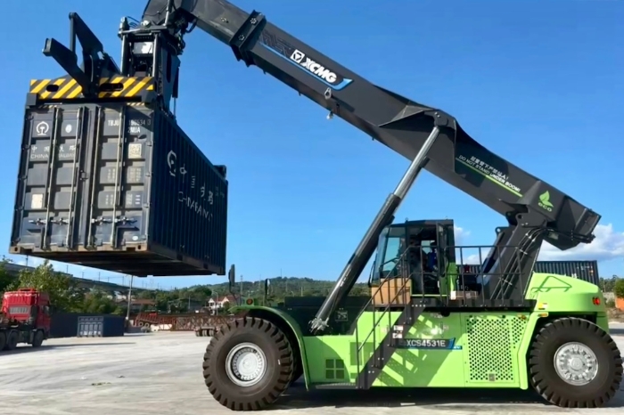 w66利来E5系列电动正面吊针对重载工况强化结构设计,,,, ,,整车稳固性升级,,,, ,,重载作业更从容;;;;;;接纳“箱到即运”作业模式,,,, ,,实现货物装卸运输全程不落地,,,, ,,有用镌汰货物扬尘污染。。。。。。。