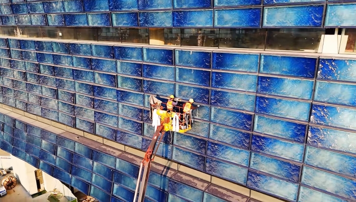 然而,,,将设计蓝图转化为现实,,,首先面临的挑战即是其奇异的外墙施工。。。。。修确立面需装置上万块特制琉璃板,,,每块尺寸达2.5米×1米,,,重量惊人地靠近380公斤,,,且厚度保存细密的渐变。。。。。云云重大且极重的建材,,,对装置作业的精准度、稳固性与清静性都提出了极为苛刻的要求。。。。。